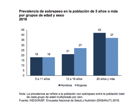 En México, de acuerdo con la Encuesta Nacional de Salud y Nutrición (ENSANUT) 2018, 18 por ciento de la población de 5 a 11 años, tiene sobrepeso. Mientras que en el rango de edad de 12 a 19 años, 21 por ciento de los hombres y 27 por ciento de las mujeres, también presentan sobrepeso. Arriba de 20 años, los hombres que son 42 por ciento “reportan una prevalencia más alta que las mujeres (37 por ciento)”.