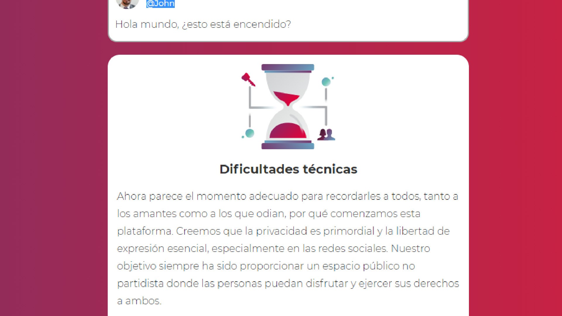 En la página aparece un saludo de su principal ejecutivo, John Matze, fechado este sábado, y un texto titulado “dificultades técnicas” en el que la empresa dice que su objetivo es “ofrecer una plaza pública no partidista” en la que las personas puedan ejercer su derecho a la privacidad y a la libre expresión.